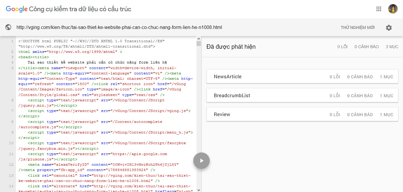 Kết quả cửa sổ bên phải hiện thị như hình sau là web của bạn đã chuẩn cấu trúc dữ liệu.